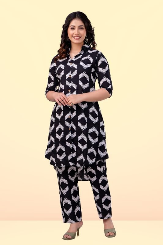 Women’s Printed Black Cord-Set Kurta with Pant, Easy to Wear, Lightweight, Breathable, Stylish & Comfortable, All-Day Comfort and Durability_S
